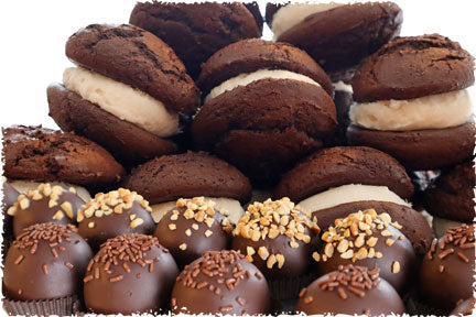 Whoopie Balls are made with the same ingredients as our traditional whoopie pies - chocolate cake and whoopie cream, but we press them into a ball (which makes the cake a bit denser) and flavor the cream center. Then we dip them in our premium milk or dark chocolate.